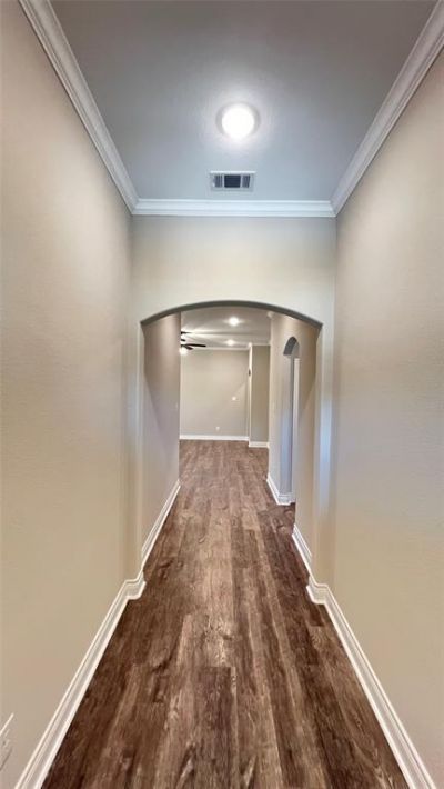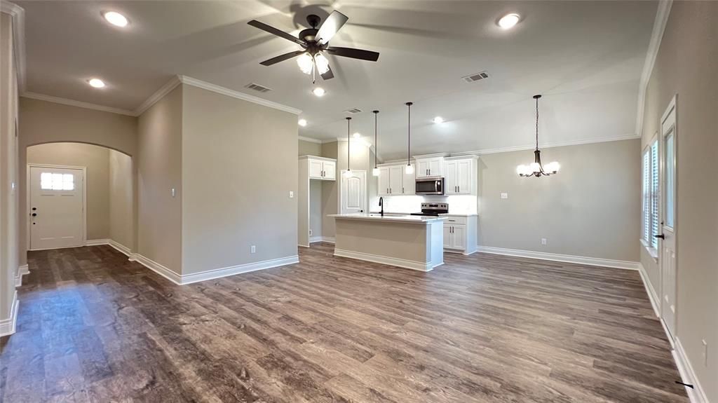 Beautifully crafted home by Scott Ellis Homes! This 3-bedroom, 2-bath residence with a 2-car garage features durable wood-look vinyl flooring throughout. Enjoy an open-concept living area with 10-foot ceilings, a spacious kitchen with quartz countertops, a large island, white cabinetry, and under-cabinet lighting. The primary suite offers dual sinks, a soaking tub, and a separate frameless glass shower. Additional highlights include ceiling fans in every room, crown molding, window blinds, and quality finishes throughout. Step outside to a covered back patio, stained fence, full sprinkler system, landscaping, and gutters. Conveniently located just minutes from L3 Harris Technologies, Interstate 30, plus nearby dining and shopping.
